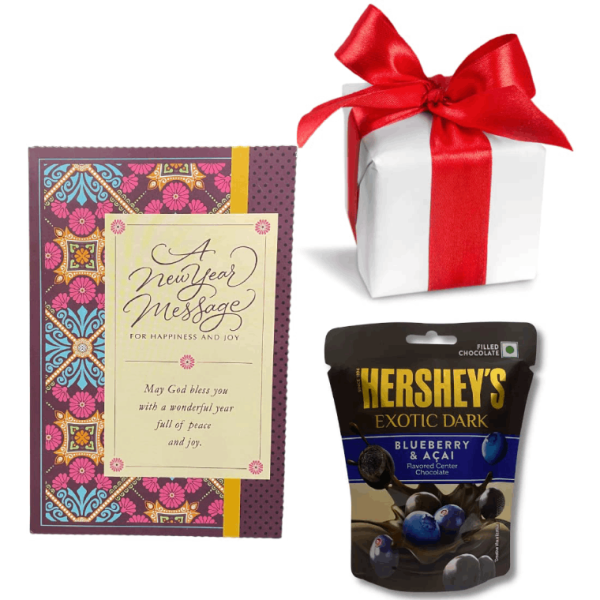 • This Combo Includes: Premium New Year Greeting Card, Hershey's Kisses Blueberry Chocolate Box with Gift Wrap and Customize Message Option
